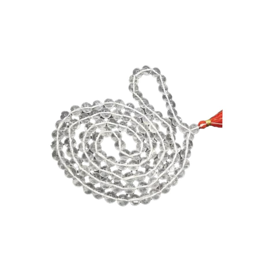 A Spatika Mala is a prayer rosary made from pure, clear quartz crystals. “Wearing a crystal quartz mala” is known to calm the mind, cool the body, and reduce stress. Spatikam is a natural amplifier of energy, making it a powerful tool for focusing intent during Japa (mantra chanting) and enhancing concentration during meditation.